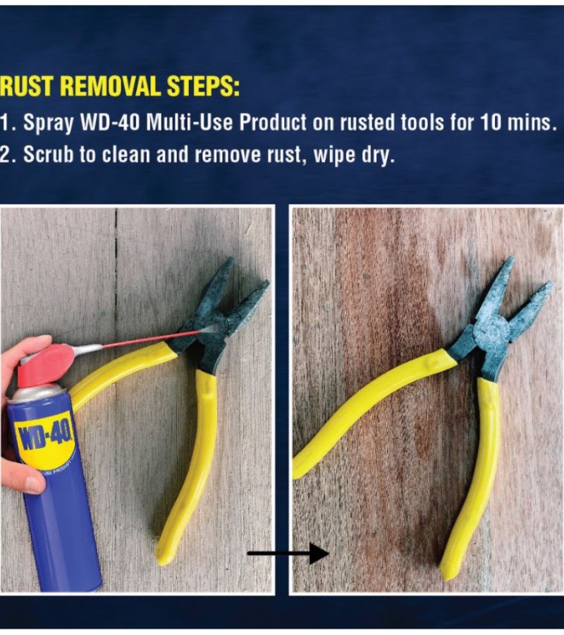 WD-40® Multi-Use Product protects metal from rust and corrosion, penetrates stuck parts, displaces moisture and lubricates almost anything. It even removes grease, grime and more from most surfaces.