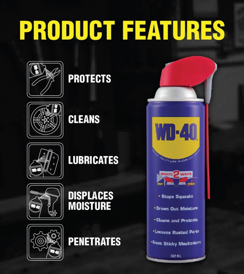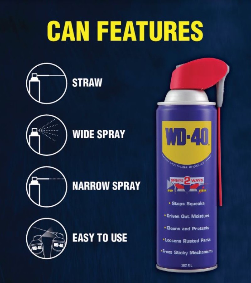 382ml SMART STRAW - NEVER LOSE THE STRAW AGAIN WITH WD-40 SMART STRAW. It features a permanently attached straw that sprays two ways. Simply flip it up for a precision stream and down for a regular spray action.